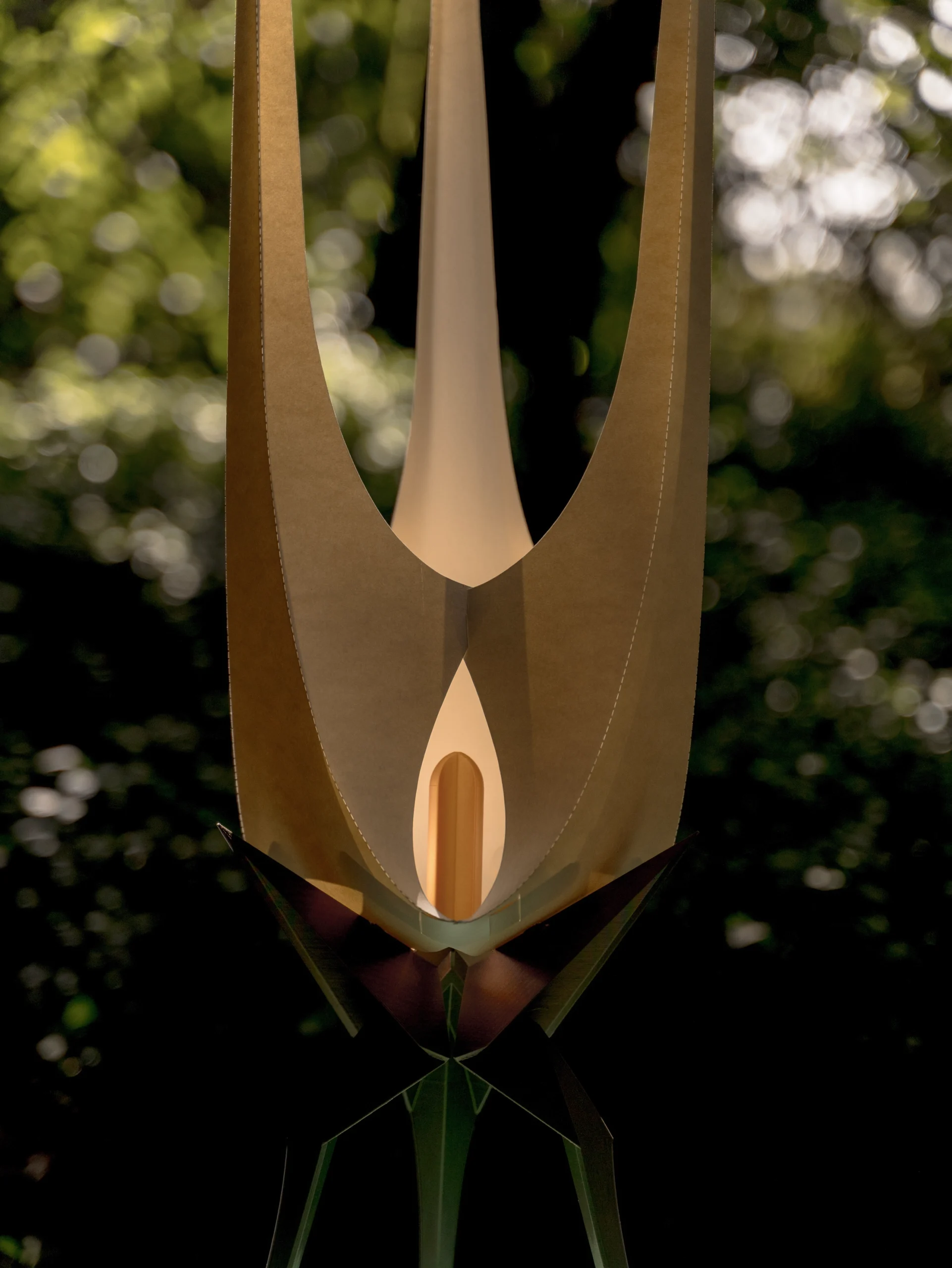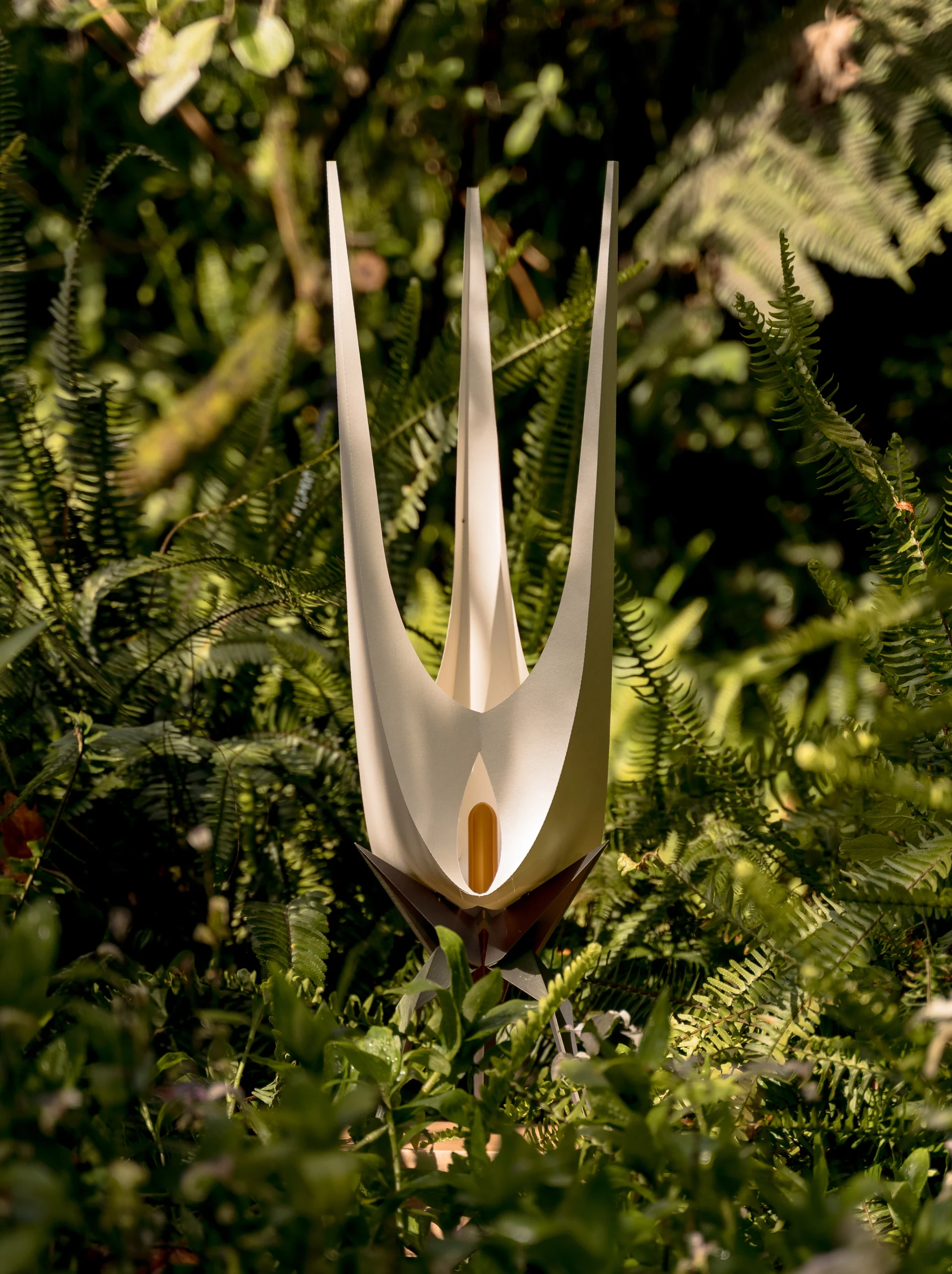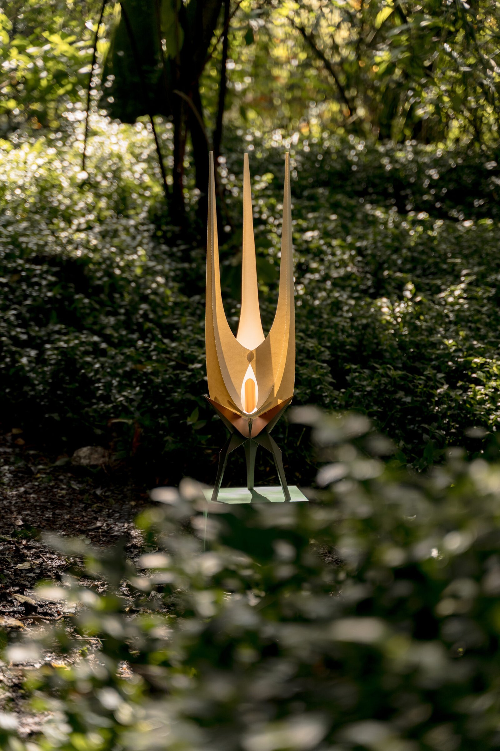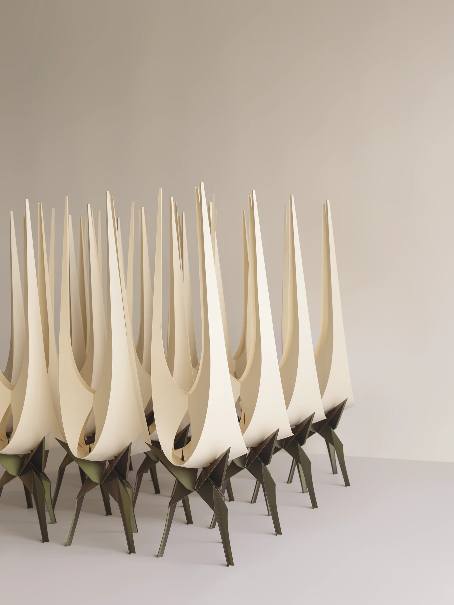 The installation brings together approximately 16 pieces arranged on a table-base, occupying one cubic meter as a silent constellation. Each element, reaching nearly one meter in height, combines a 3D-printed root-like base with an upper body made of structural folded paper. Rather than representing specific trees, the works operate as a metaphor for accumulation, repetition, and loss measured over time.